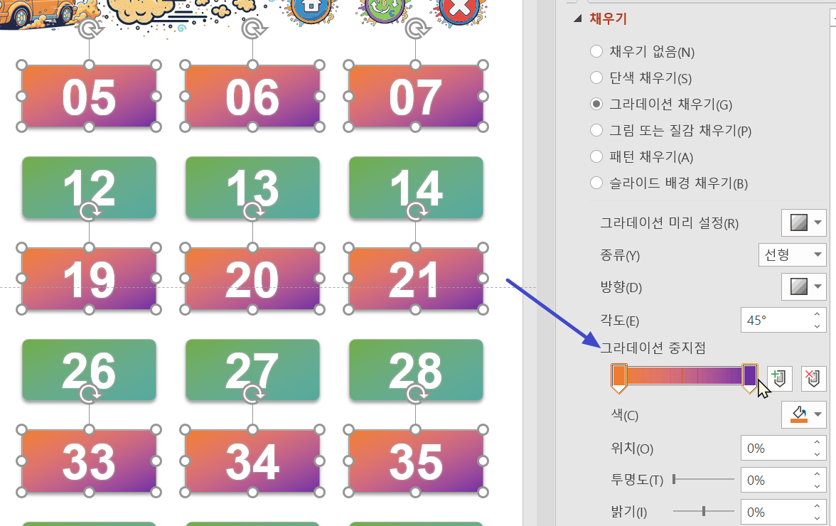 도형 속성에서 그라디언트 색상을 조절해주면 좋습니다.