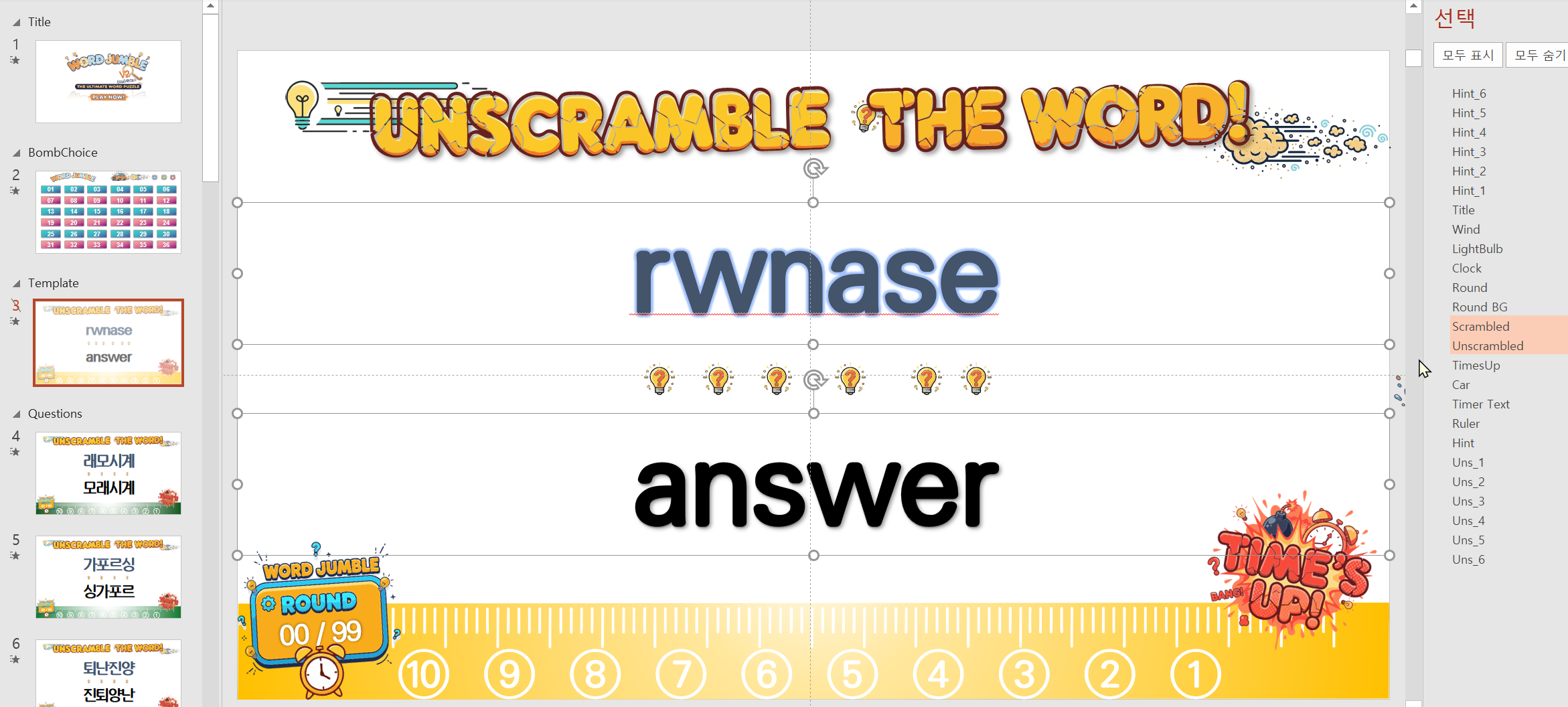 - Bomb Game 형식이지만 문제 슬라이드에서 클릭하면 다음 문제로 넘어갑니다. 뒤로 돌아와서 Round 버튼을 눌러야 번호 선택슬라이드로 돌아옵니다. 화면전환에 체크를 해제하면 되지만 그렇게 되면 클릭할 때 애니메이션이 넘어가지 않습니다.