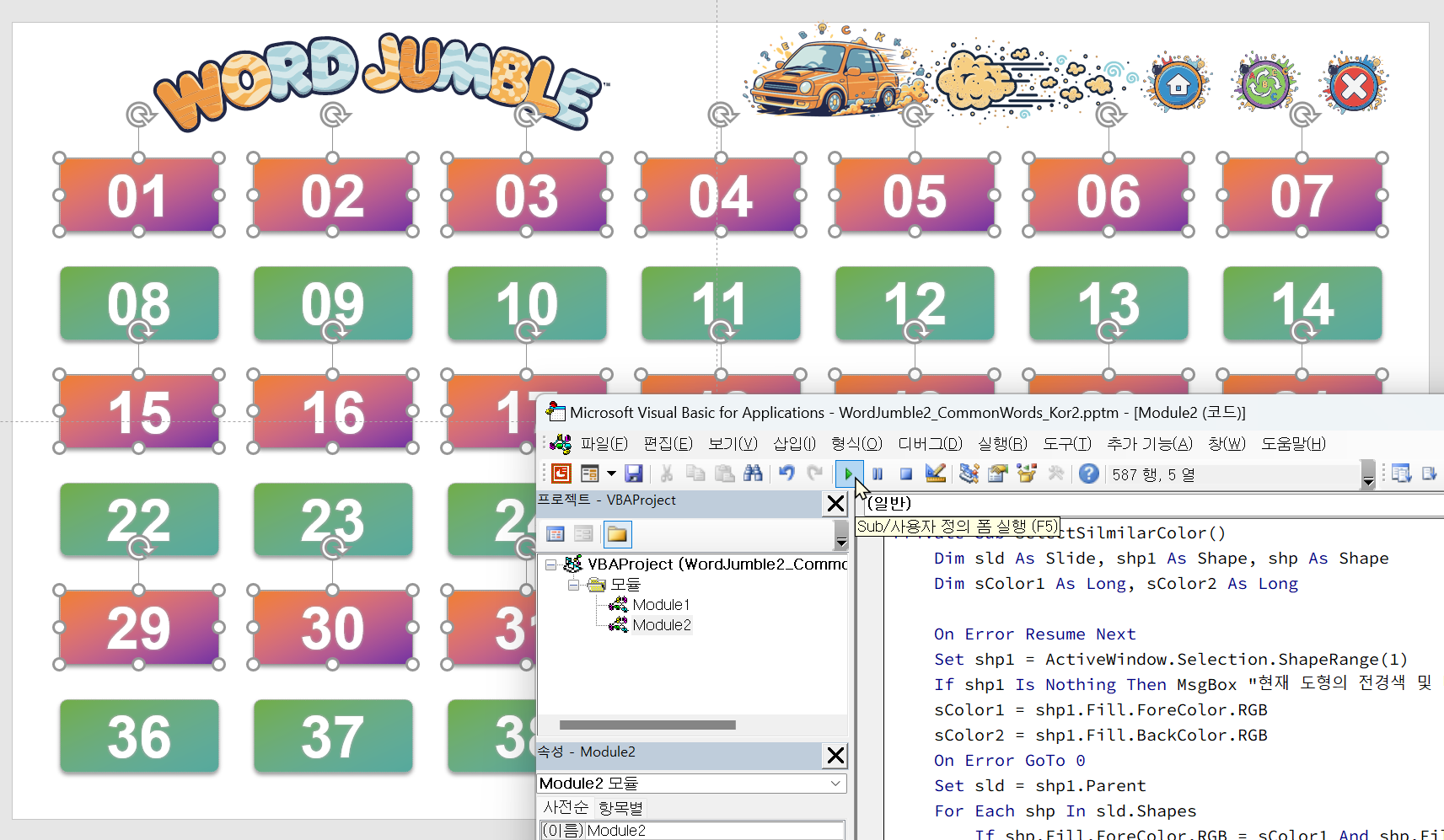 버튼을 하나 선택하고 Module2의 SelectSimilarColor 를 실행해서 같은 색깔 버튼들을 일괄 선택하고