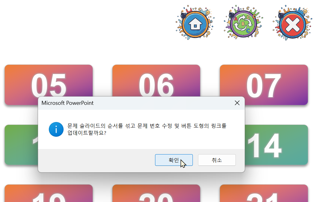 슬라이드쇼에서 오른쪽 상단 '문제 섞기' 아이콘을 누르면 문제 슬라이드의 순서를 랜덤으로 섞어줍니다.