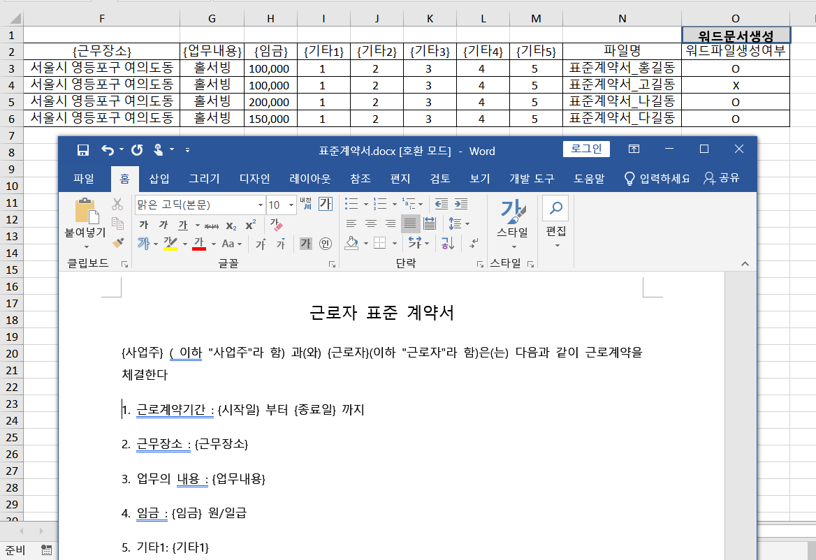 각 행의 데이터로 바꿔서 아래 워드 문서를 만들어서