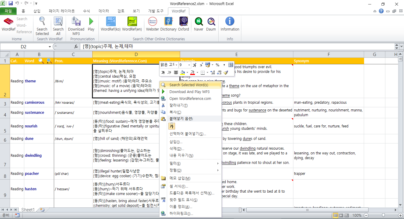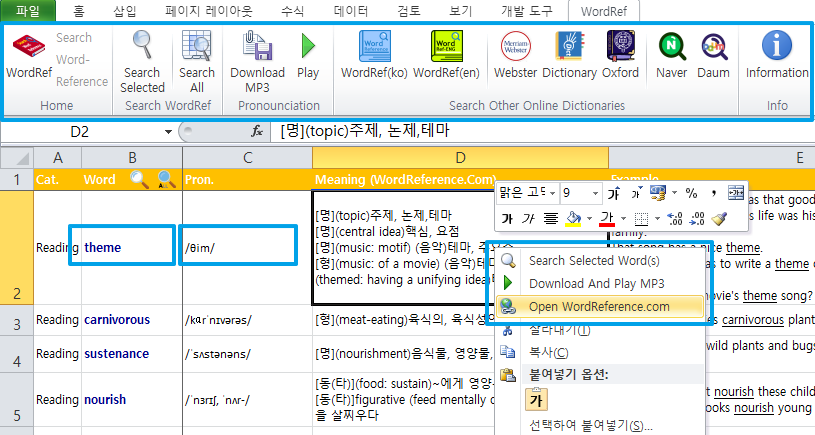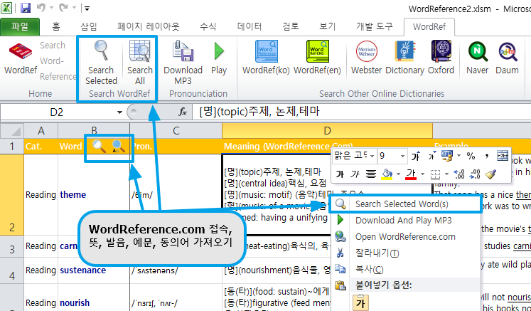 - 'WordRef' 라는 추가기능 탭이 생겨나서 메뉴 호출이 간편합니다.