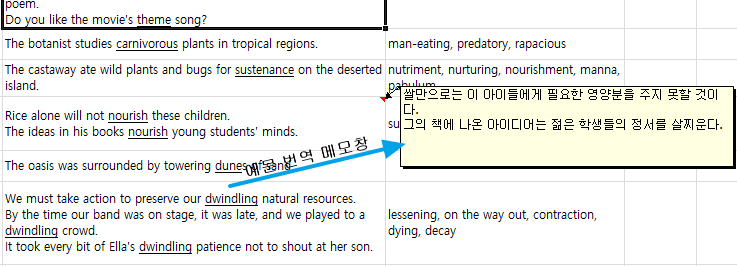 4. 예문에 번역이 있는 경우 메모창에 해석을 보여줍니다.