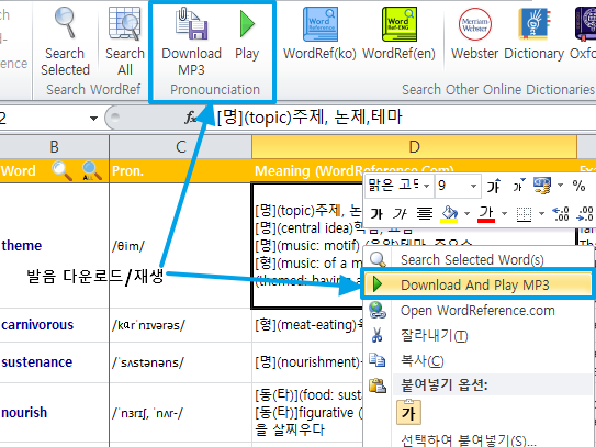 MP3파일을 다운로드하거나 현재 행의 단어에 해당하는 MP3폴더의 로컬MP3를 재생합니다.