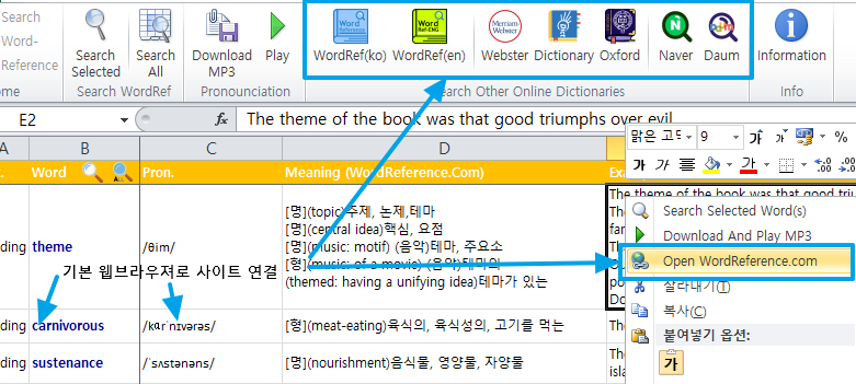 일단, B열의 단어를 클릭하면 wordReference 사이트를 방문하고