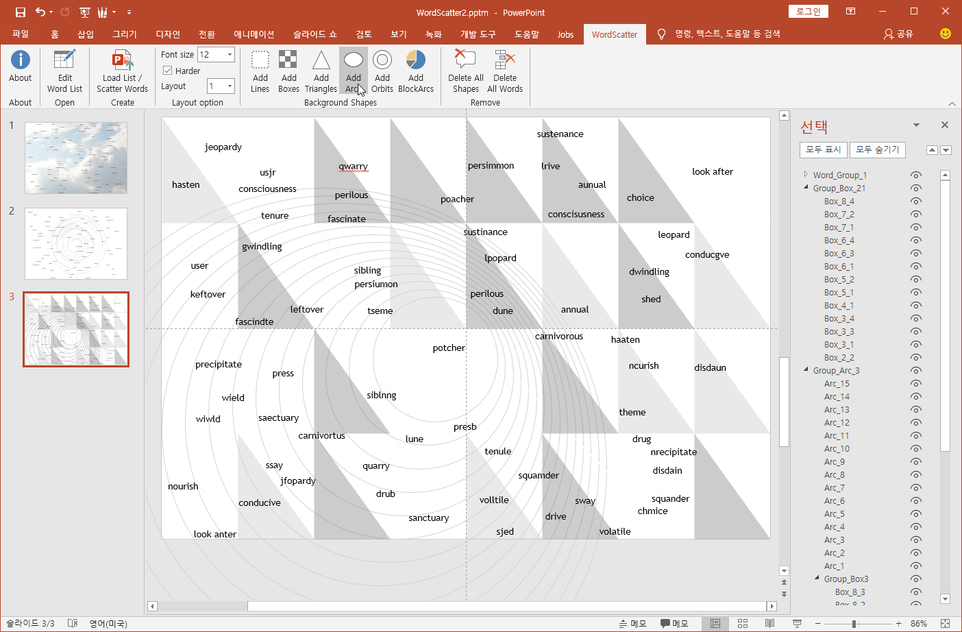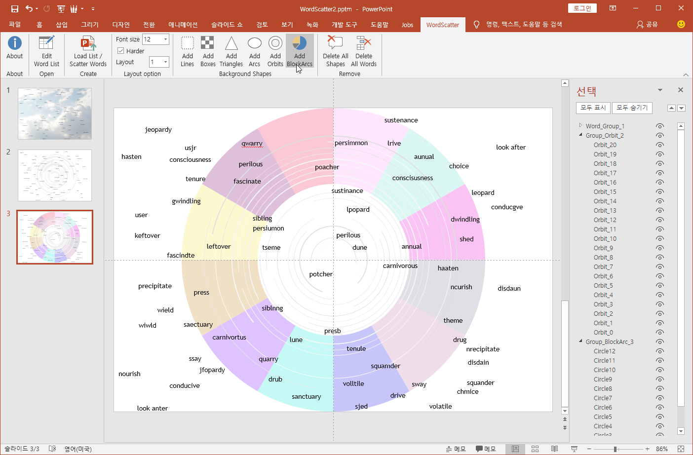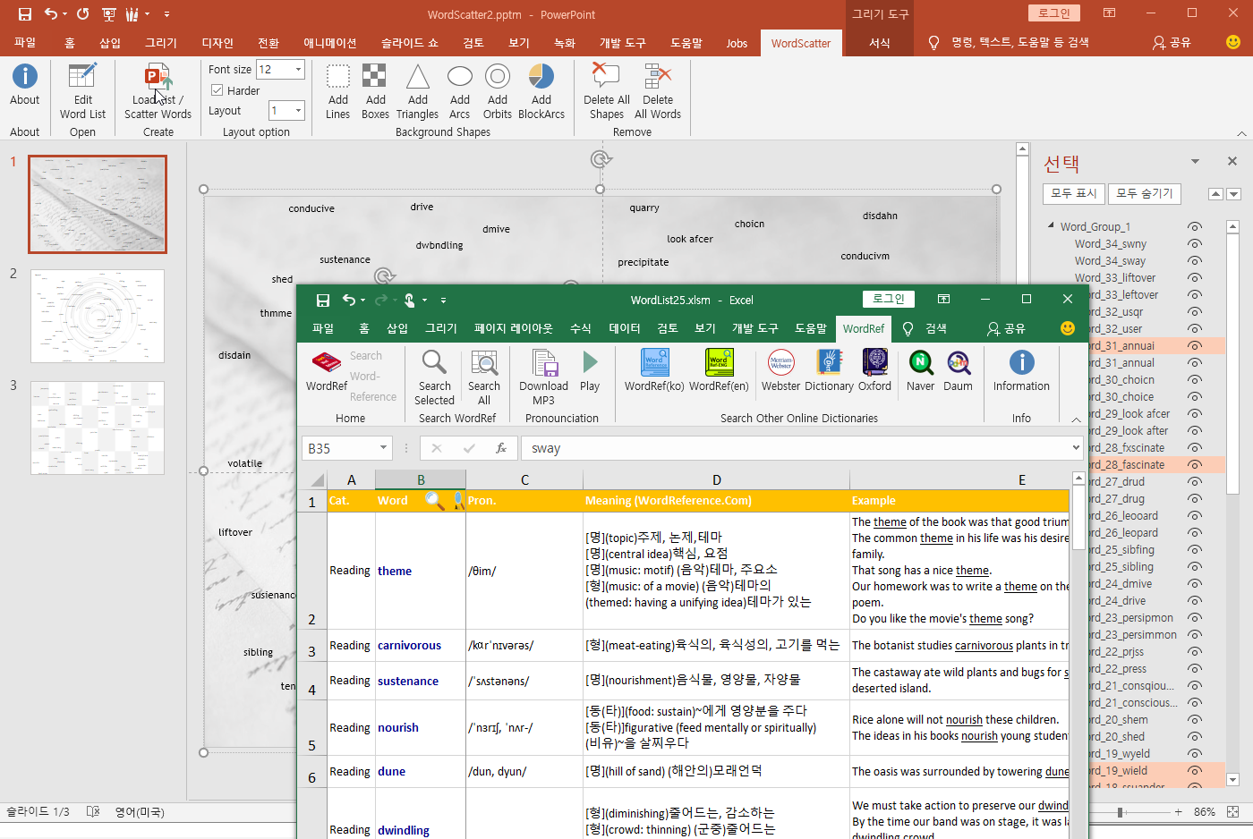 다음 첨부파일 안의 두 가지 파일(WordList25.xlsm, WordScatter.pptm)을 참고하세요.