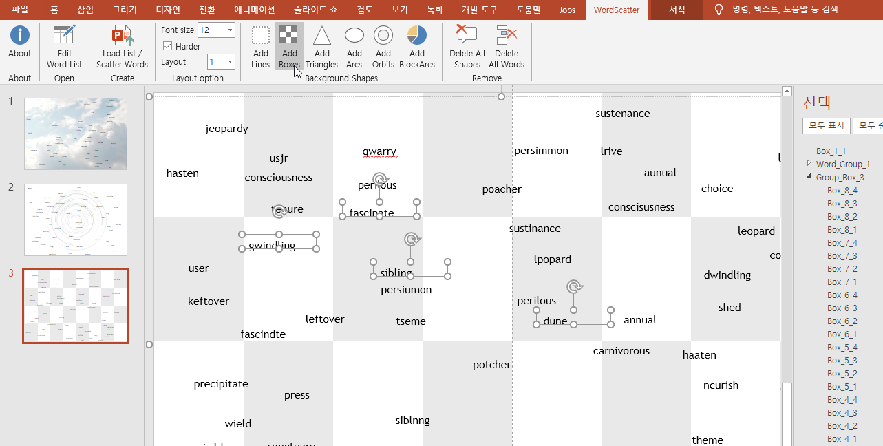 Add Boxes 는 바둑판 모양 네모를 추가합니다.