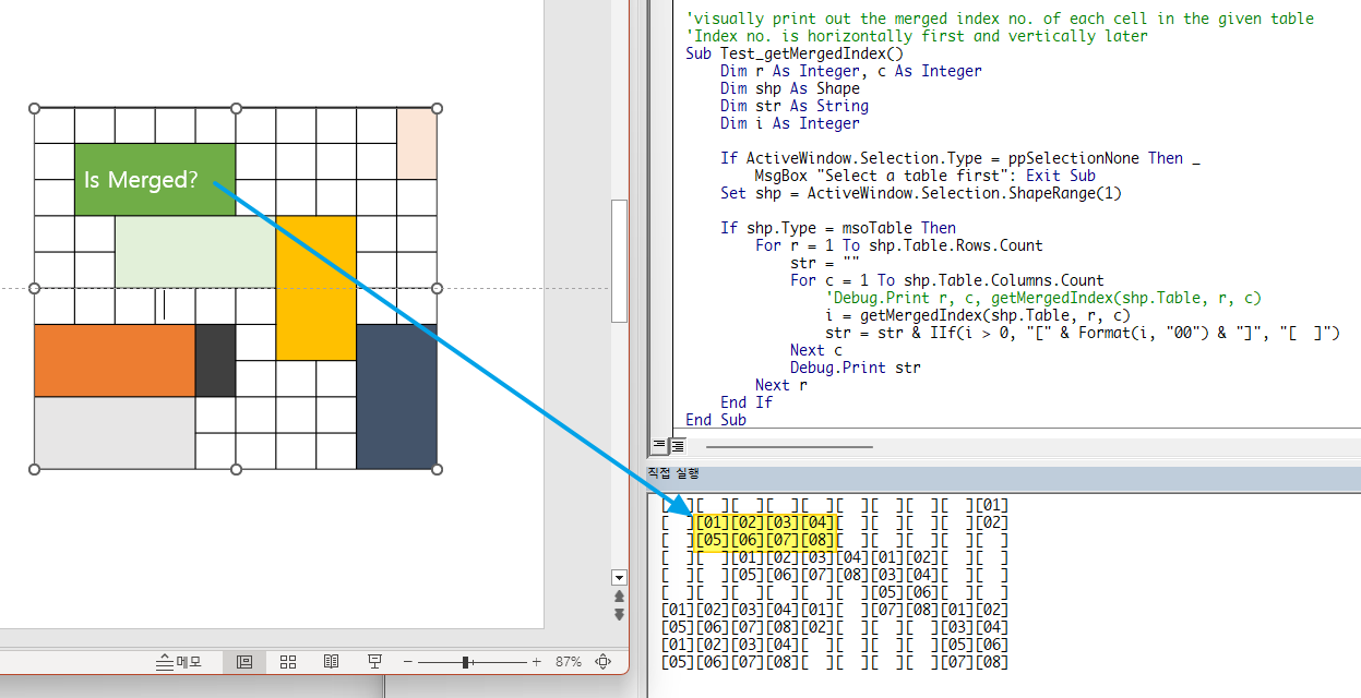 여기에서부터 출발해서 파워포인트에서 지원하지 않는, 병합된 셀과 관련한 함수들이 절실히 필요합니다.