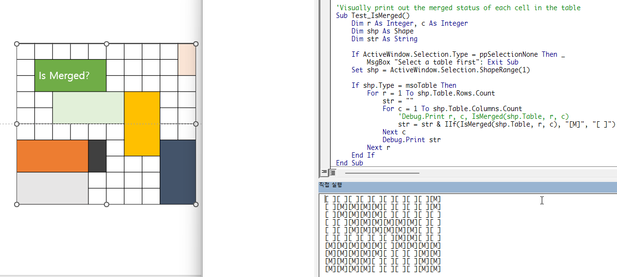 VBA에서 파워포인트 표안의 셀이 병합되었는지 확인하는 것이 실제로는 간단하지 않습니다.