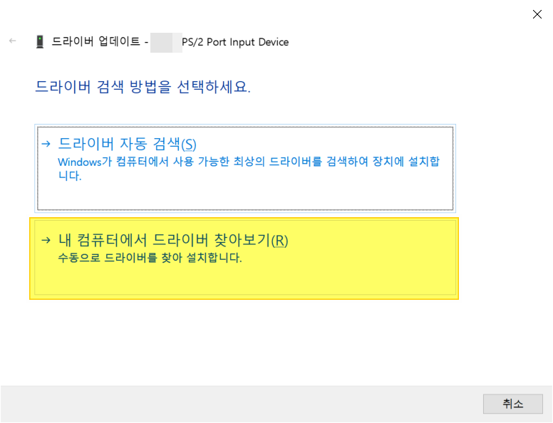 시작 > 실행에서 devmgmt.msc 를 실행하고 표준 PS/2마우스(아래 PS/2 Port Input Device 는 현재 장치명) 드라이버 업데이트를 클릭.