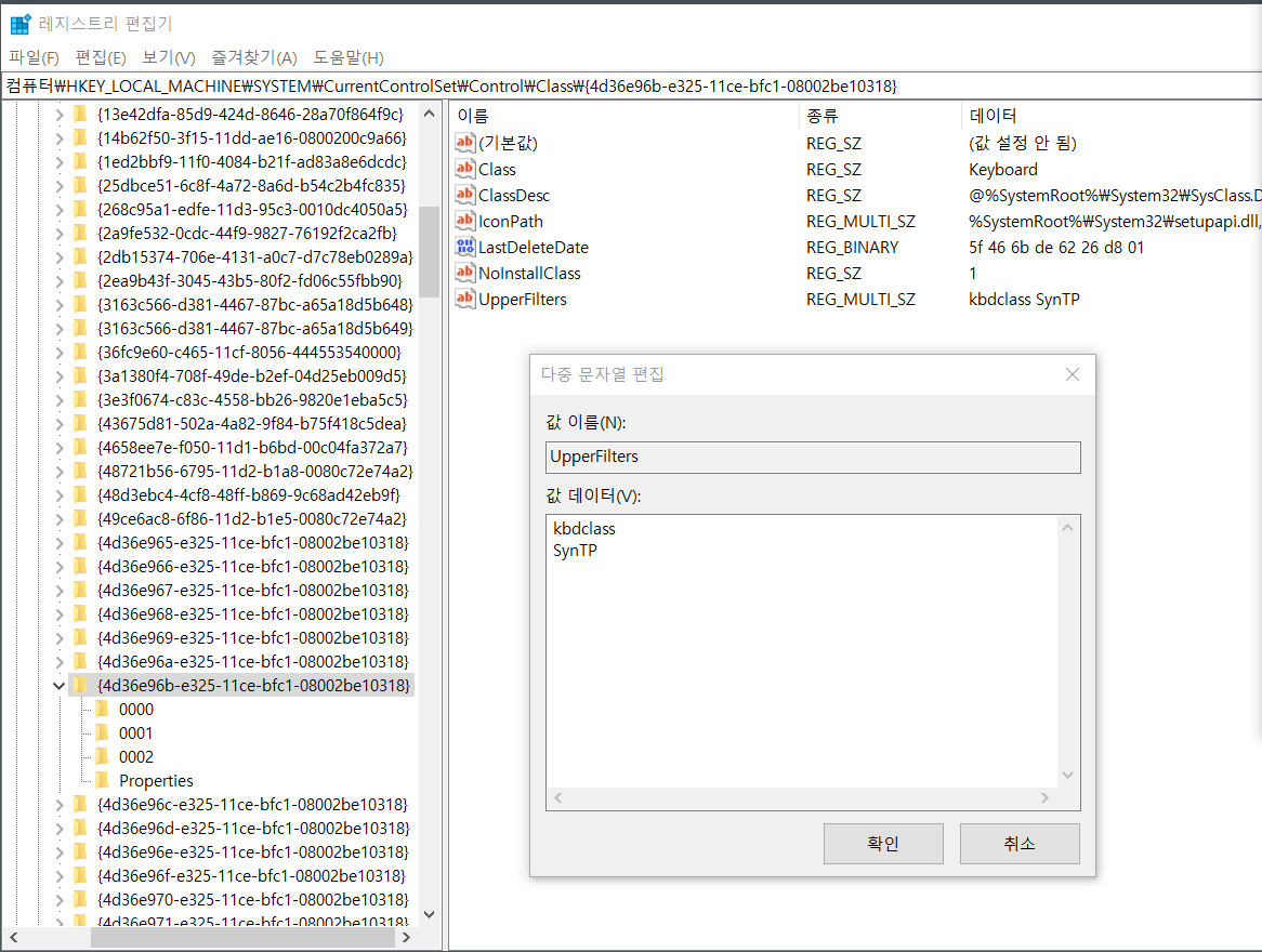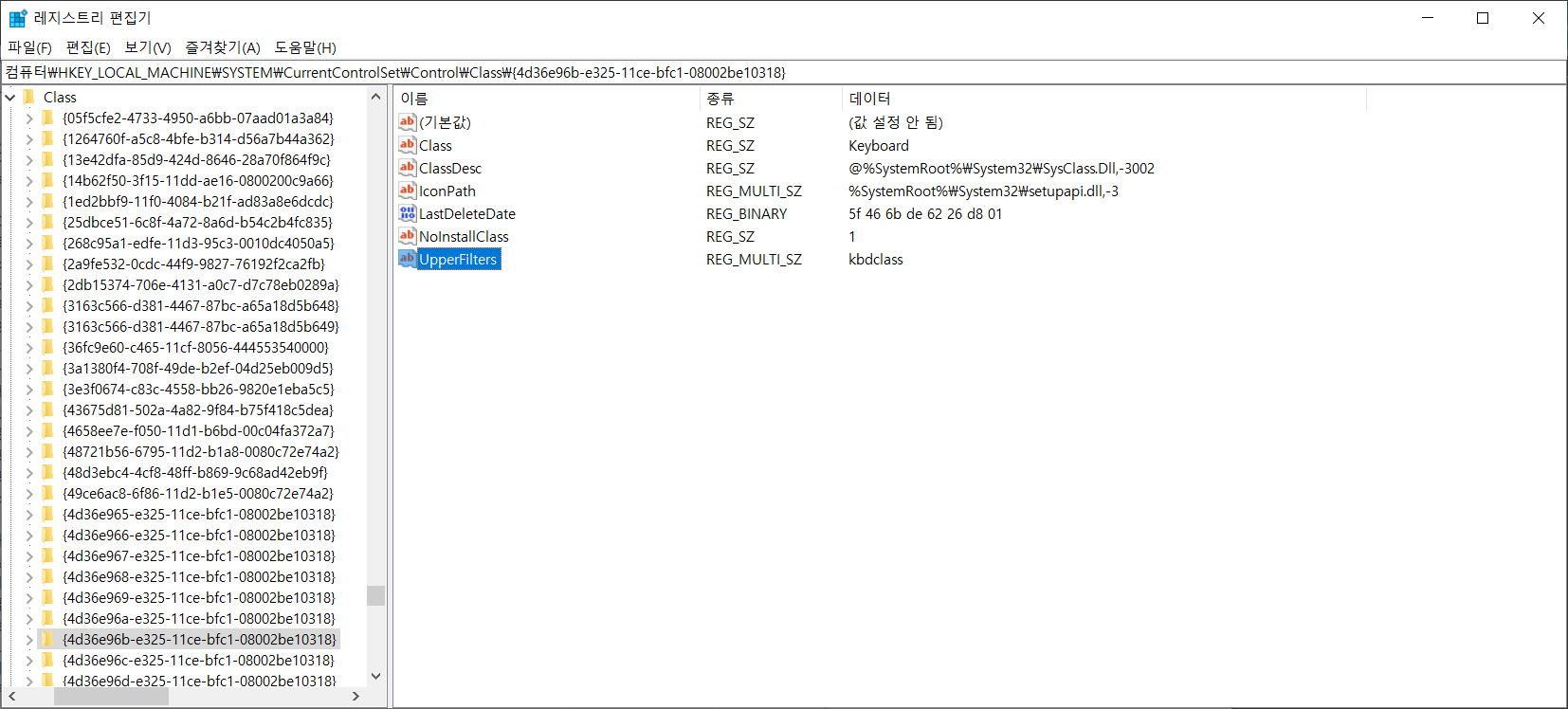 그러다가 위 사이트를 참고로 해서 레지스트리에서 '찾기' 기능으로 f_kp_St 가 있는 부분을 모두 검색하다가 kbdclass를 불러오는 부분의 upperfilter에서 f_kp_St 를 제거해보았습니다.
