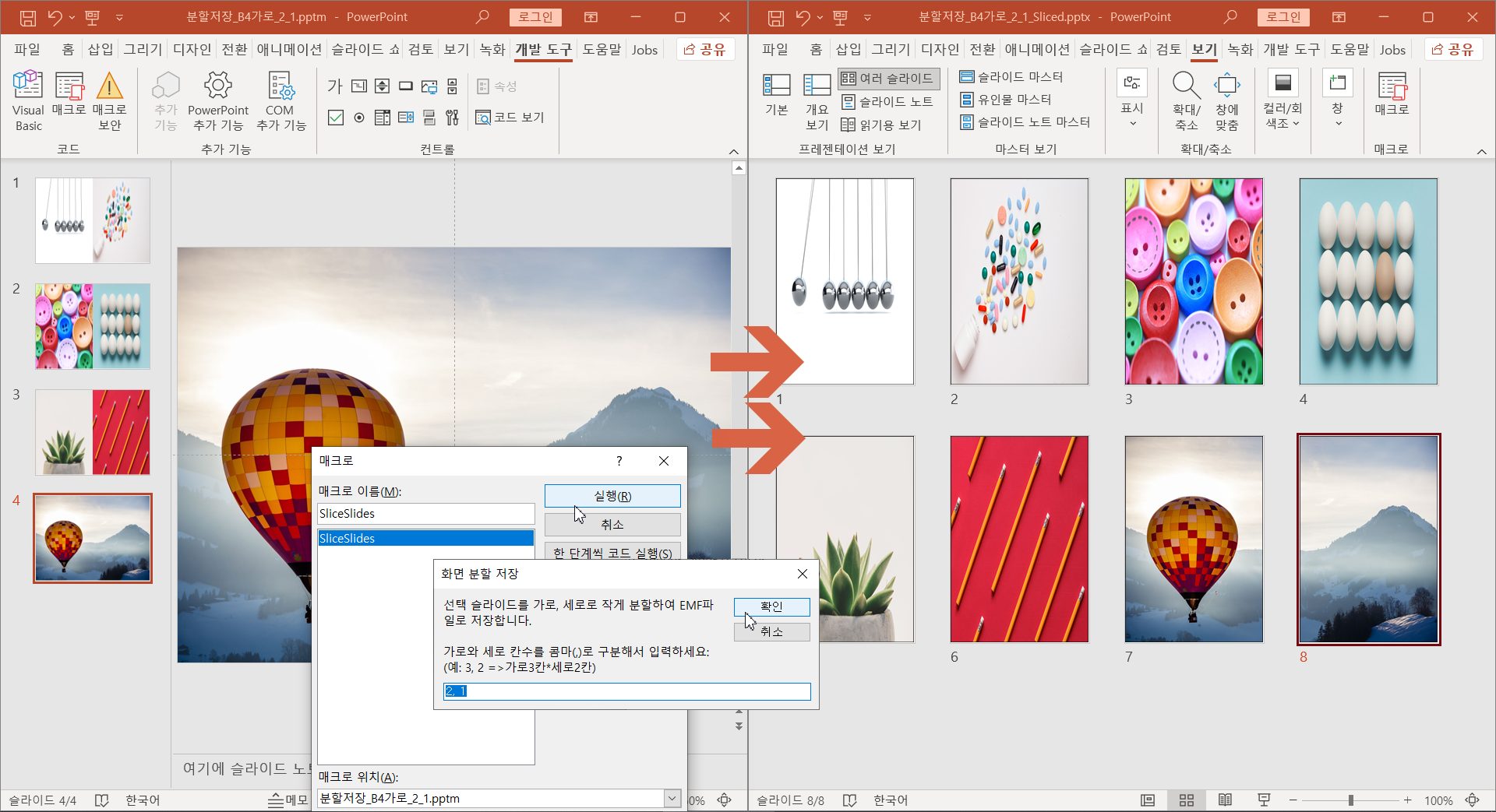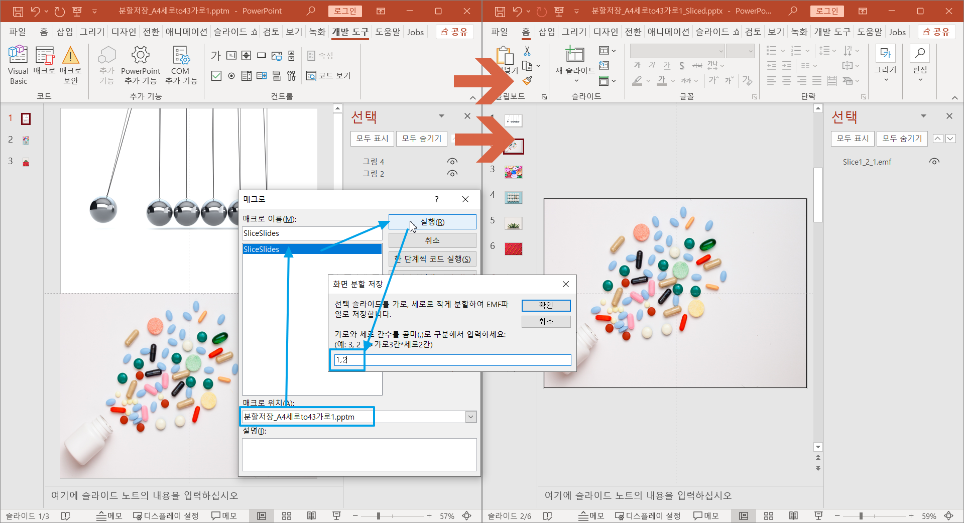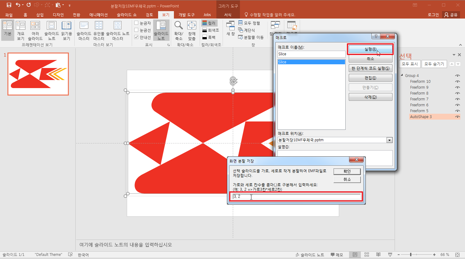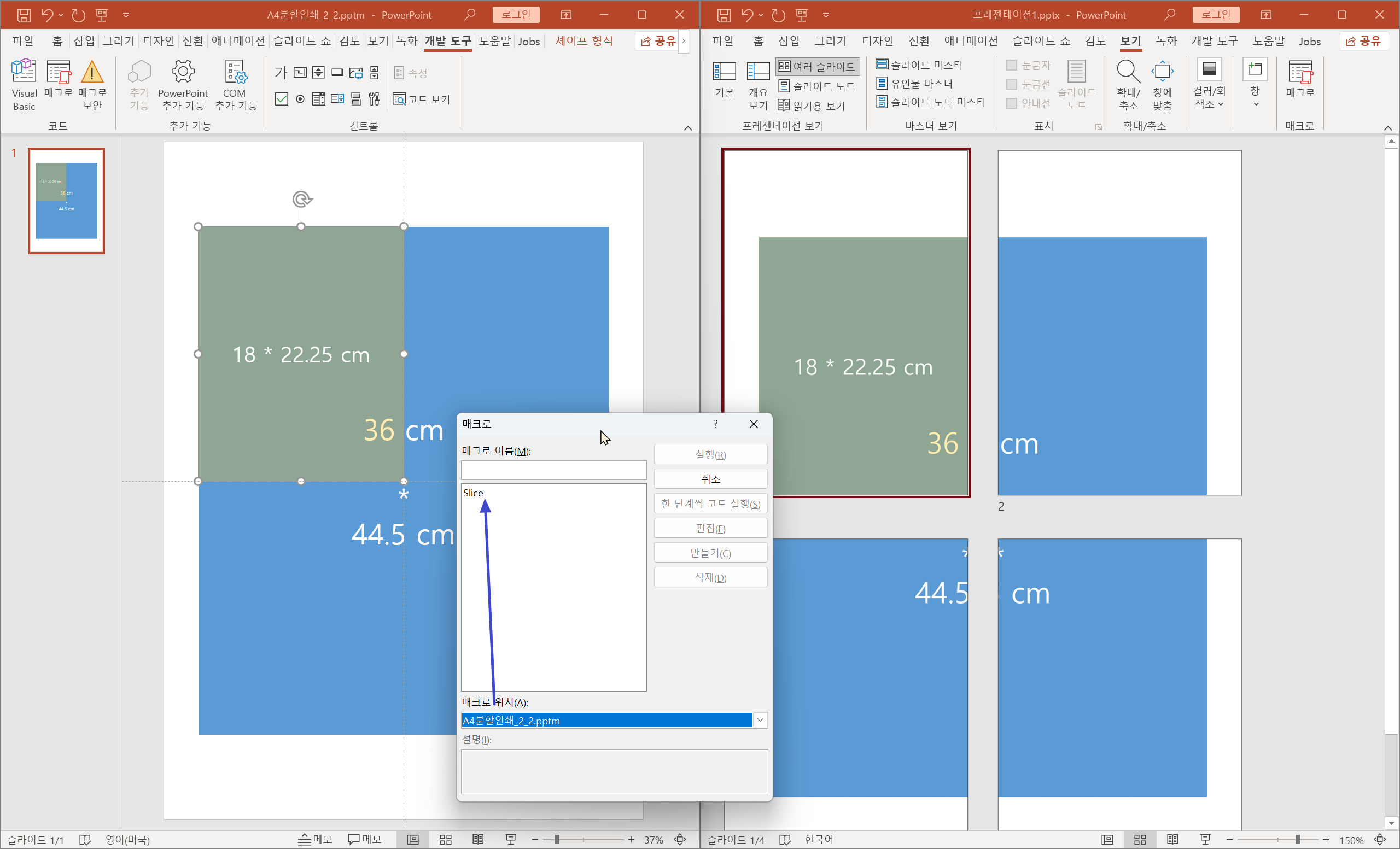 매크로 위치를 첨부파일 pptm으로 선택한 뒤에 SliceSlides 를 실행합니다.
