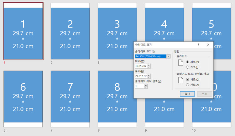 만일 A4 슬라이드를 3, 2로 나눈 다면 아래처럼 가로 29.7/3, 세로 21/2 로 슬라이드 사이즈가 바뀌도록 했습니다.