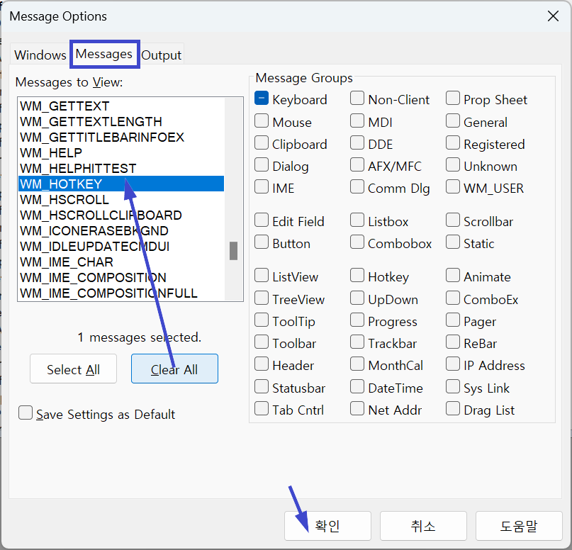 Messages to View 에서 WM_HOTKEY 선택 후 확인 눌러서 단축키활동만 모니터 시작.