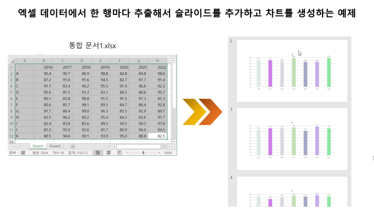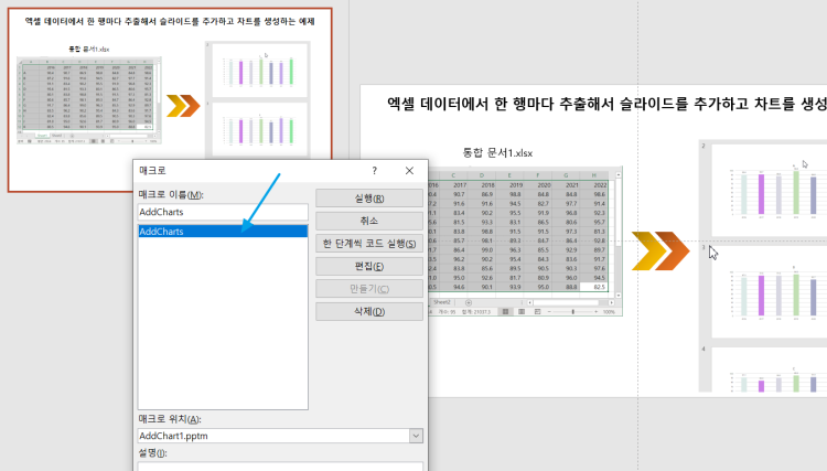 첨부한 pptm을 매크로 허용해서 여시고 Alt-F8누른 다음에 AddCharts 를 실행하세요.