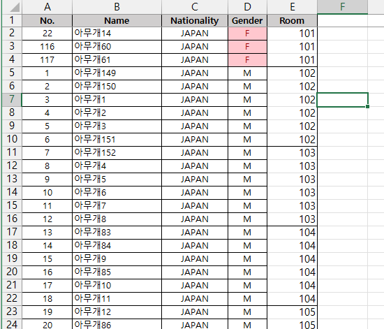 그리고 나서 (자동으로) 여자부터 방번호순으로 정렬시켜서 '원본 파일 _Sorted.xlsx' 파일에 저장합니다.