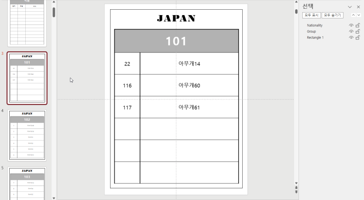 시트순서 즉 국가순서로 계속 마지막 시트까지, 마지막 방번호까지 슬라이드와 표를 생성합니다.