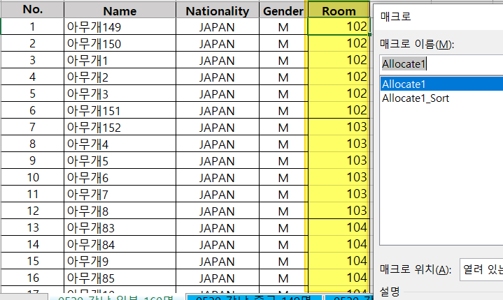 ( 가능한 방번호가 정해져있을 경우 배열로 방번호 목록을 미리 만들어 두어야 합니다. ) - 각 국가별 시트 순서대로 배정합니다.