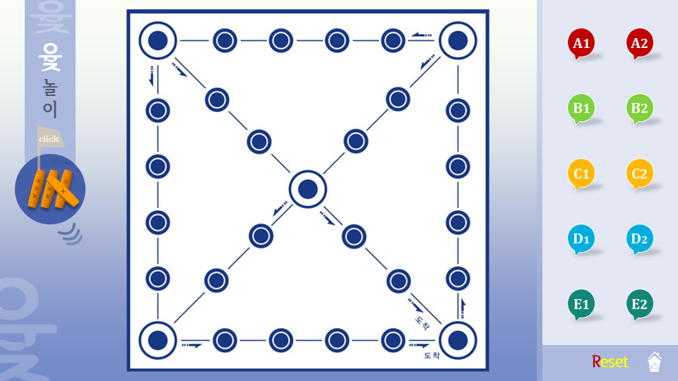 윷놀이 규칙에 따라 말을 움직여서 먼저 들어온 팀이 이기게 됩니다.