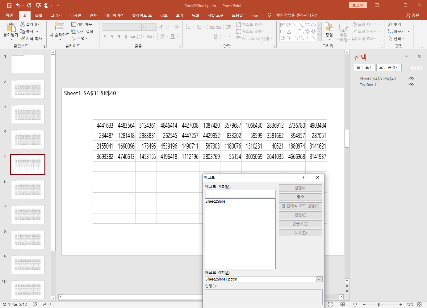 엑셀 각 시트를 10행씩 끊어서 파워포인트 각 슬라이드에 붙여넣기
