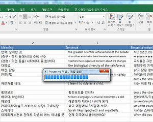 단어 리스트에 대해 실시간으로 네이버사전을 검색해서 첫번째 뜻과 예문 등을 가져오고 또한 해당 단어 발음(첫번째 미국식)을 Mp3폴더에 자동으로 다운 받는 매크로입니다. 사용법: 첨부파일을 다운받고 매크로 컨텐츠를 허용합니다. 2행부터는 삭제해도 됩니다. B열에 Word 아래에 단어목록을 적습니다. 많이 적을 수록 검색 시간이 길어집니다. 좌측 상단 '검색' 버튼을 누르면 위 화면과 같이 네이버 영어사전에서 단어를 검색합니다. Mp3폴더 아래에 단어명.mp3 파일을 다운로드합니다. (매크로 파일이 있는 폴더에 Mp3폴더가 미리 있어야 합니다.) 1.각 단어에는 해당단어에 대한 네이버사전으로 하이퍼링크가 추가됩니다. 자세히 알고 싶을 때 클릭하면 브라우져 창이 열립니다. 2. 발음기호를 클릭하면 다운 받은..