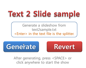 TEXT2SLIDE 텍스트파일을 읽어서 자동으로 한 문장씩 슬라이드쇼로 만들어 줍니다. Convert a plain text file into a PowerPoint slide. that is, convert each line to a slide Generate 버튼 텍스트파일 선택창이 열리면 문장이 들어있는 텍스트파일을 선택합니다. 그러면 문장단위로 슬라이드쇼를 자동으로 생성합니다. 현재 문장 제한 갯수는 없습니다. 아래 첨부한 샘플 텍스트(text2sample.txt)를 이용해보세요. 100가지 영어 속담들입니다. 텍스트파일 속 가 기준이 되어 슬라이드가 생성됩니다. 생성된 슬라이드의 텍스트글자 색깔은 랜덤으로 바뀌어 생성됩니다. Revert 버튼 슬라이드 1 다음에 생성된 슬라이드들을 모두 지우고 ..